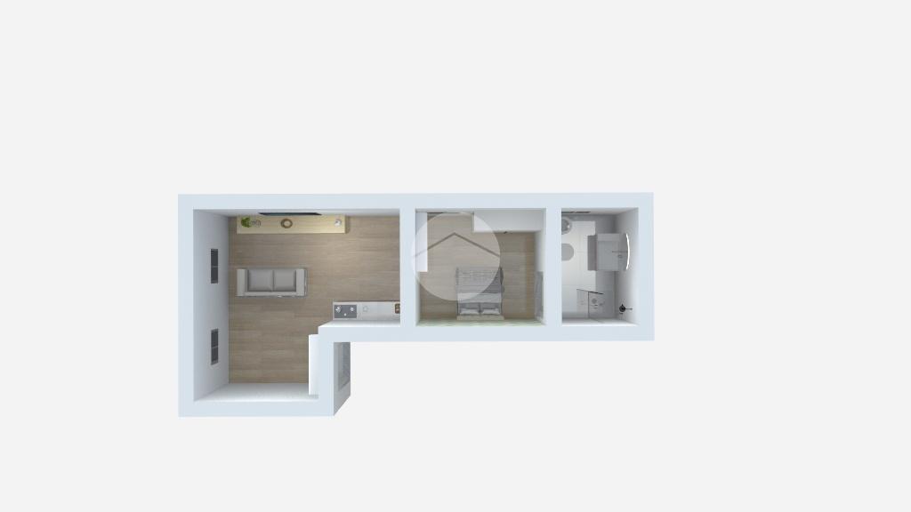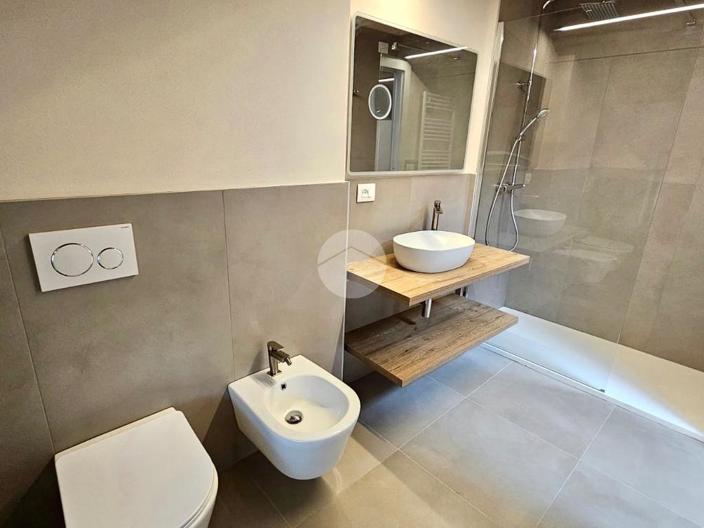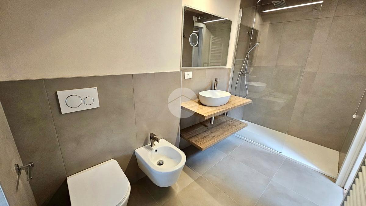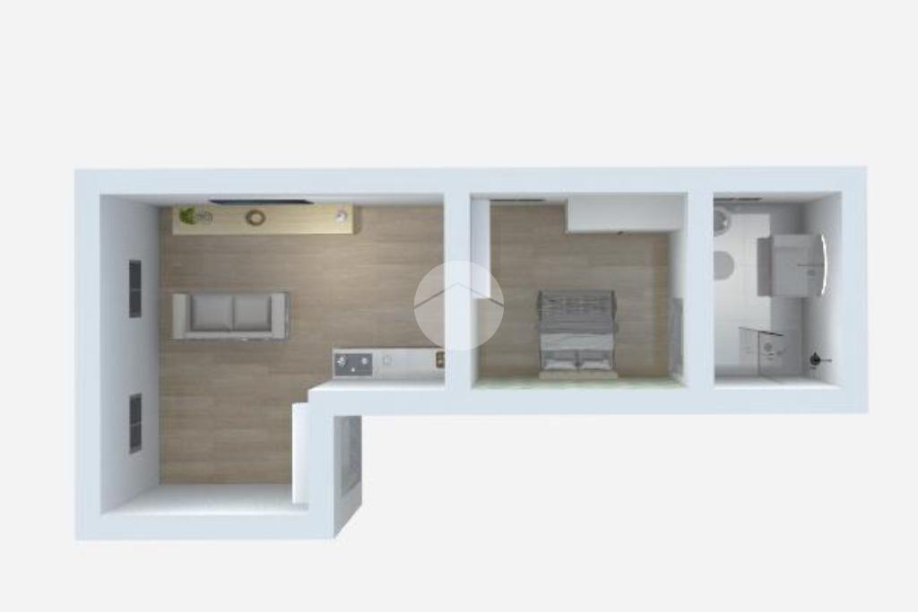 Il bilocale, situato al piano primo e raggiungibile tramite scala interna o ascensore, si apre su un'elegante zona living con divano e mobile tv e un completo angolo cottura; la zona notte presenta una camera da letto matrimoniale e bagno comprensivo di doccia e attacco per la lavatrice. Il riscaldamento è a pompa di calore e l'immobiledispone di attacco TV e connessione internet inclusi.