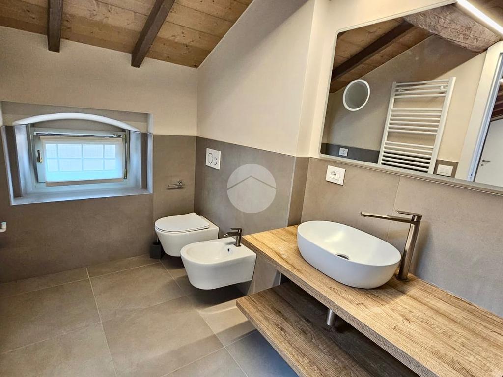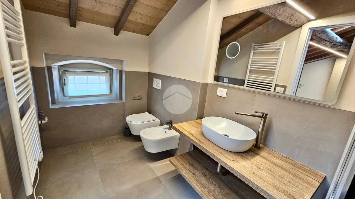 L'intero appartamento è impreziosito da eleganti travi a vista.