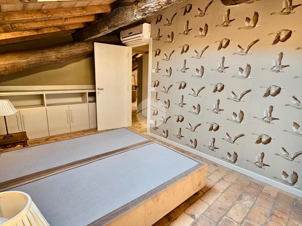 L'intero appartamento è impreziosito da eleganti travi a vista in ciliegio.