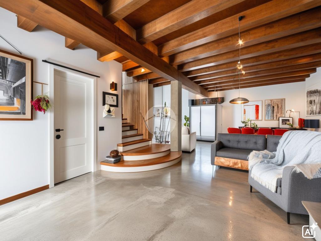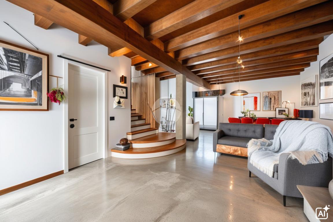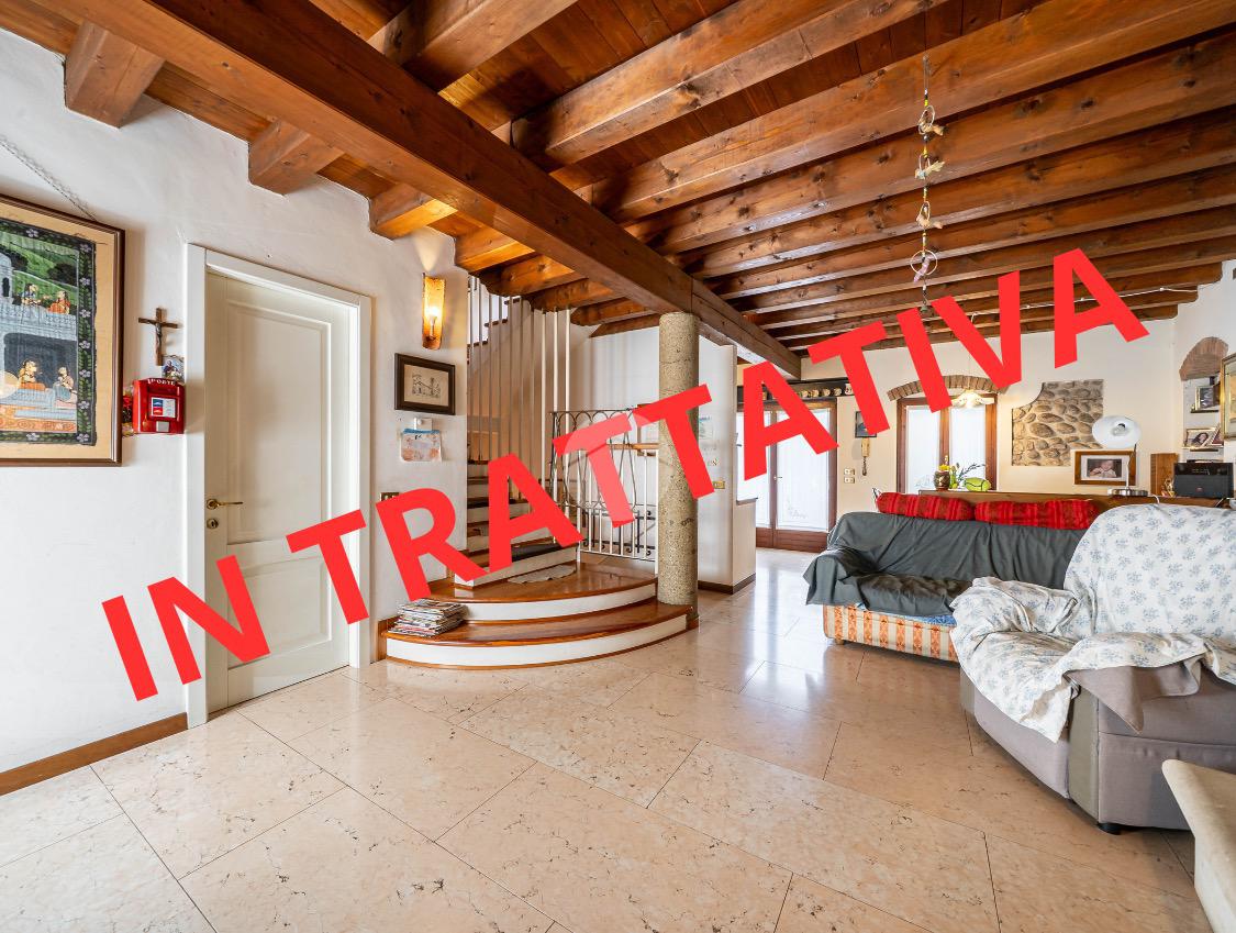 Le travi a vista in legno presenti in tutta l'abitazione donano un sapore caldo agli ambienti.