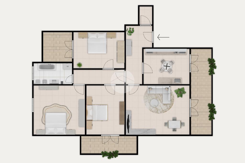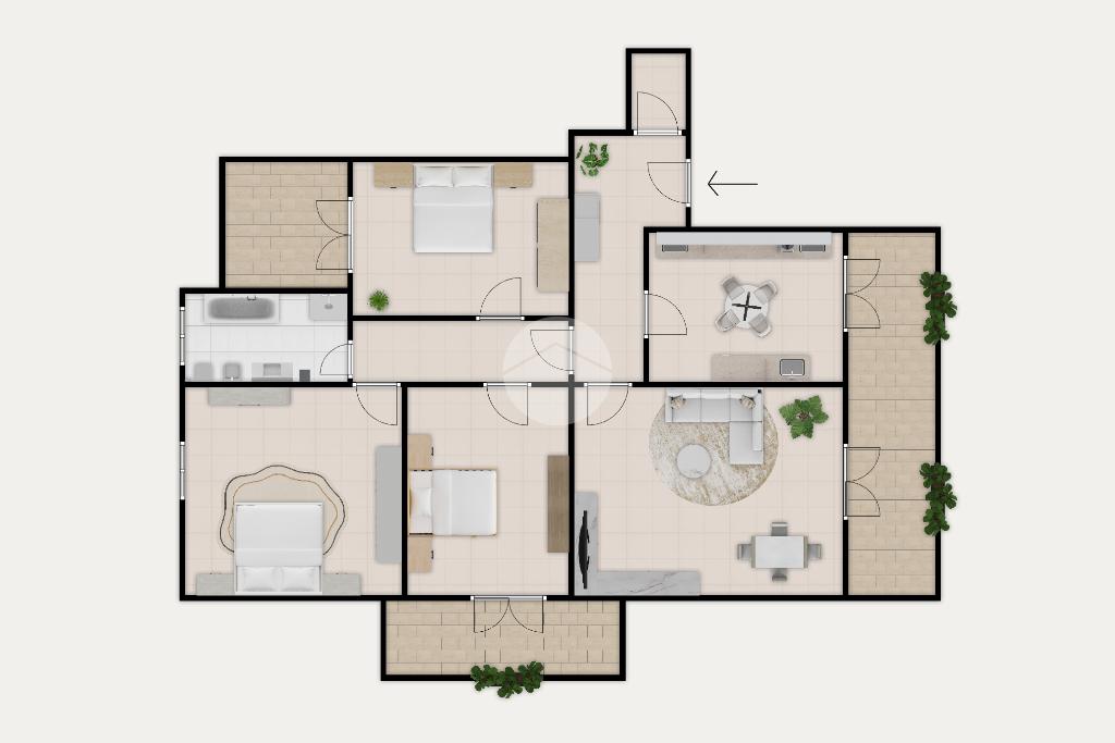 Proseguendo, accediamo alla zona notte composta da tre camere da letto, una matrimoniale e due doppie, entrambe con terrazzo privato, infine un ampio bagno finestrato comprensivo sia di doccia sia di vasca.