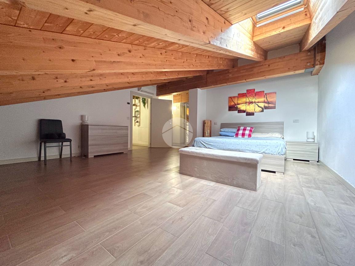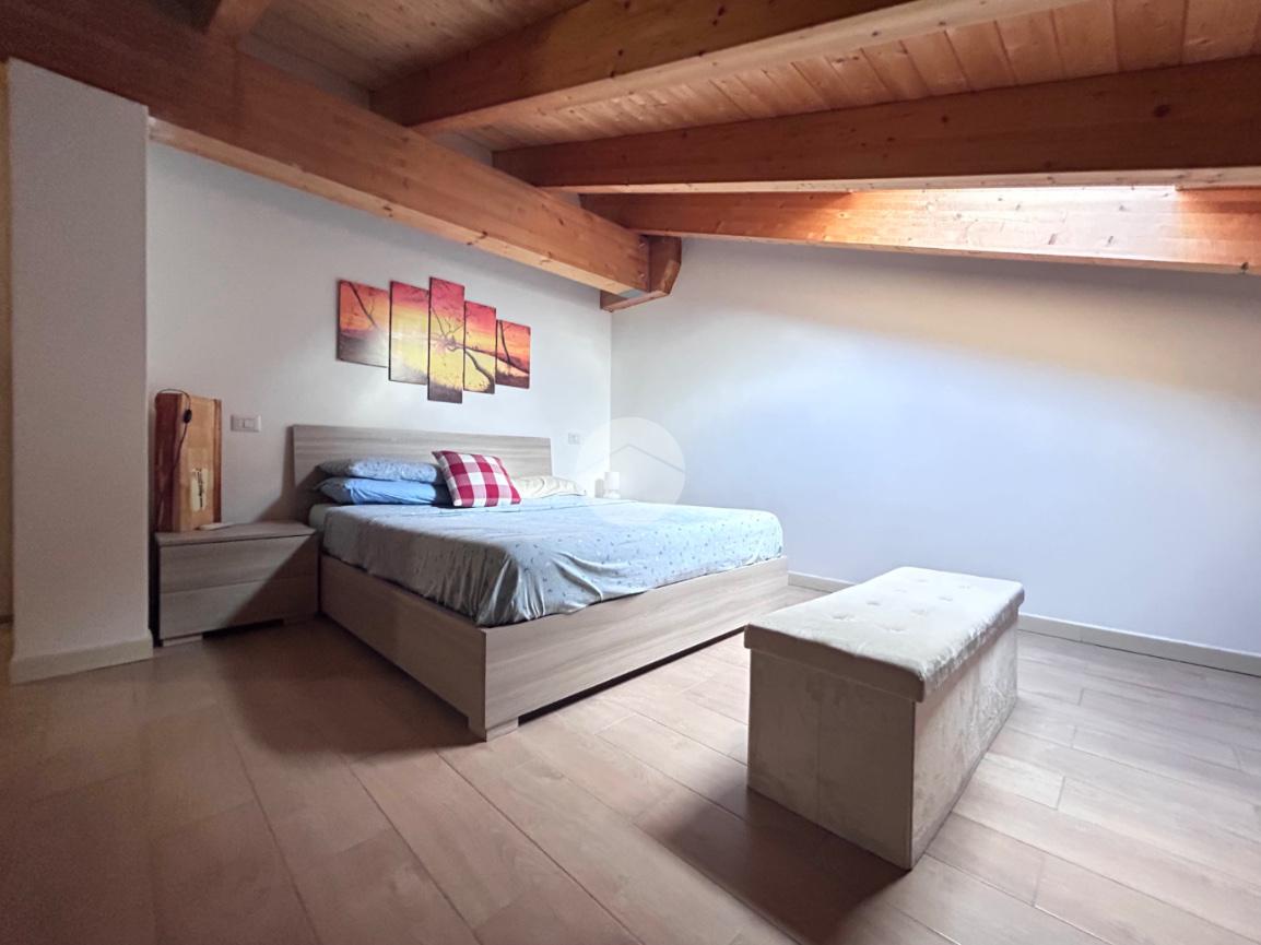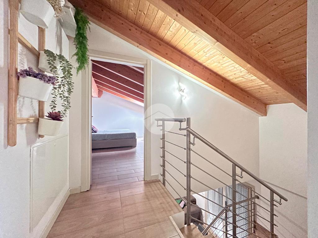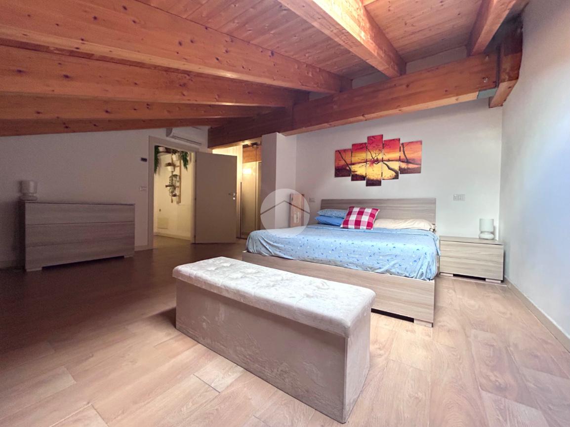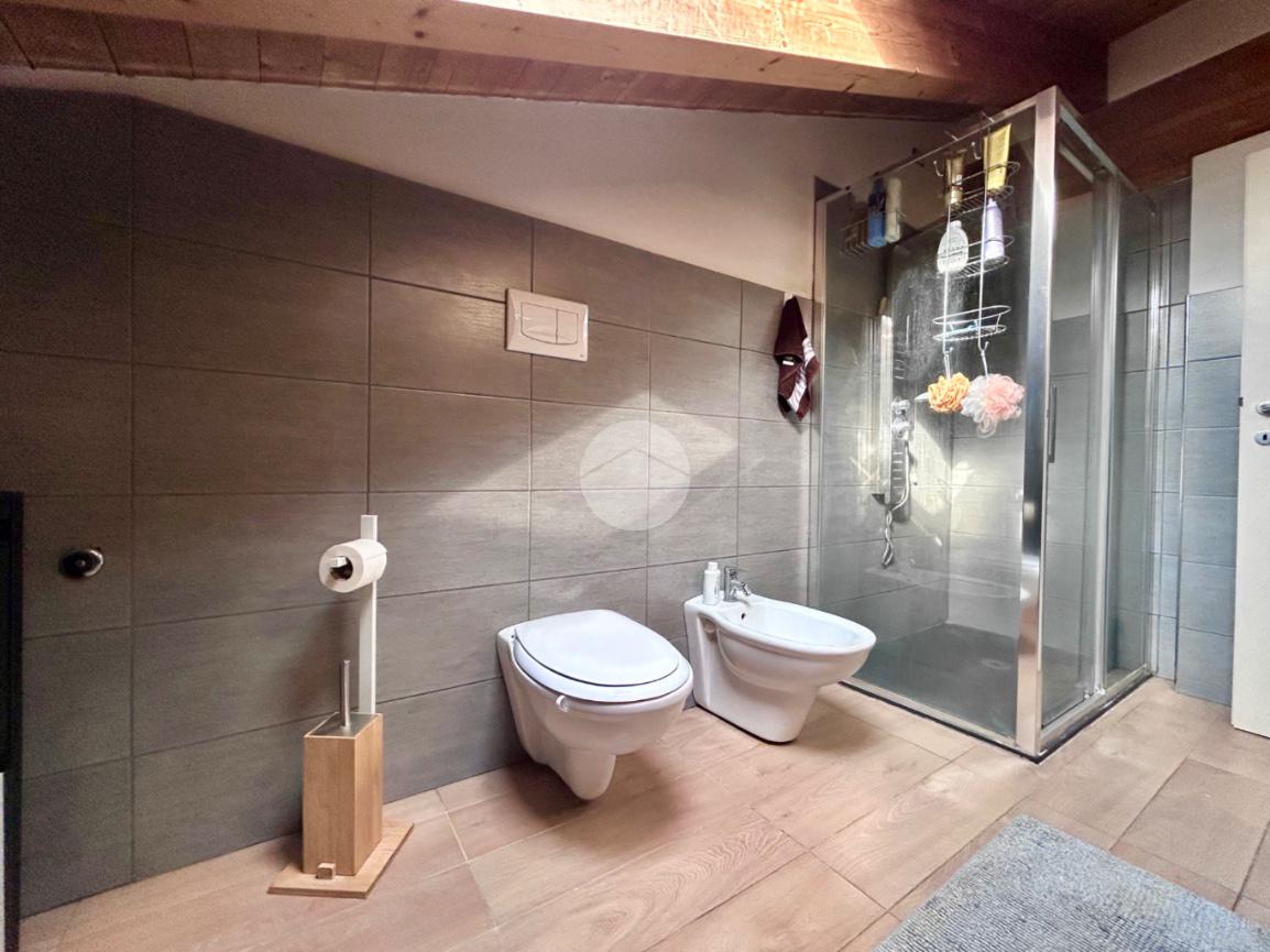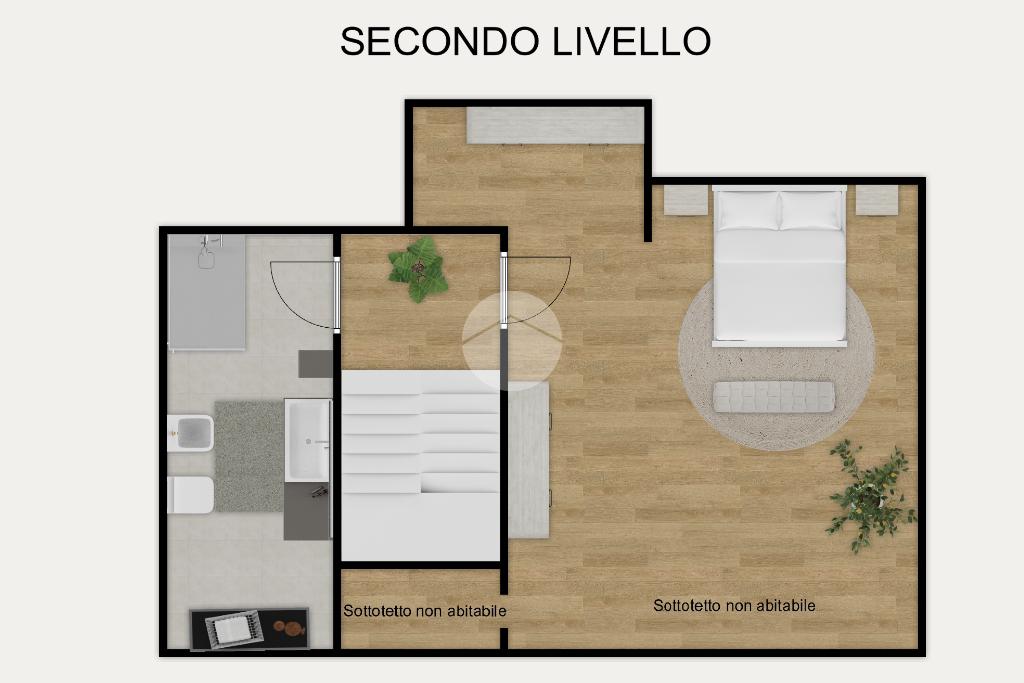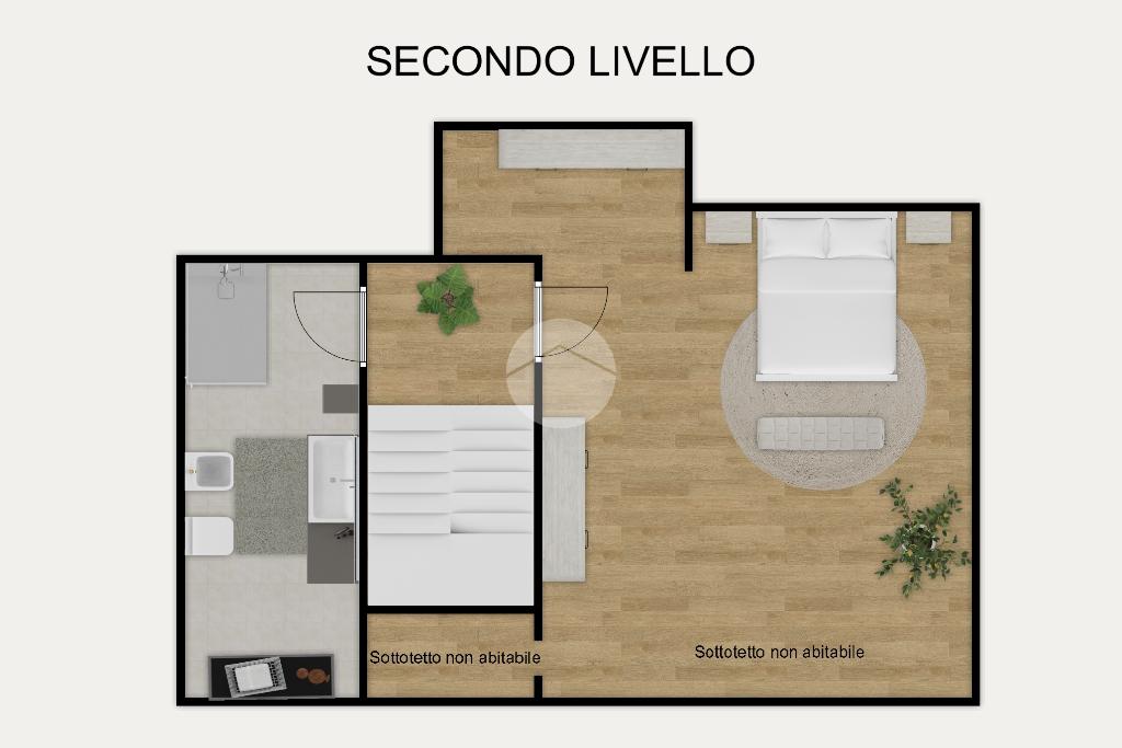 Dalla scala interna accediamo al secondo livello mansardato ove è presente il bagno finestrato con velux comprensivo di doccia, e ampia camera matrimoniale con angolo cabina armadio, anch’essa finestrata con velux.
