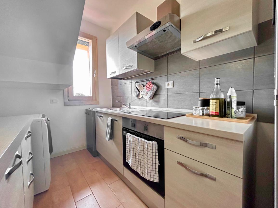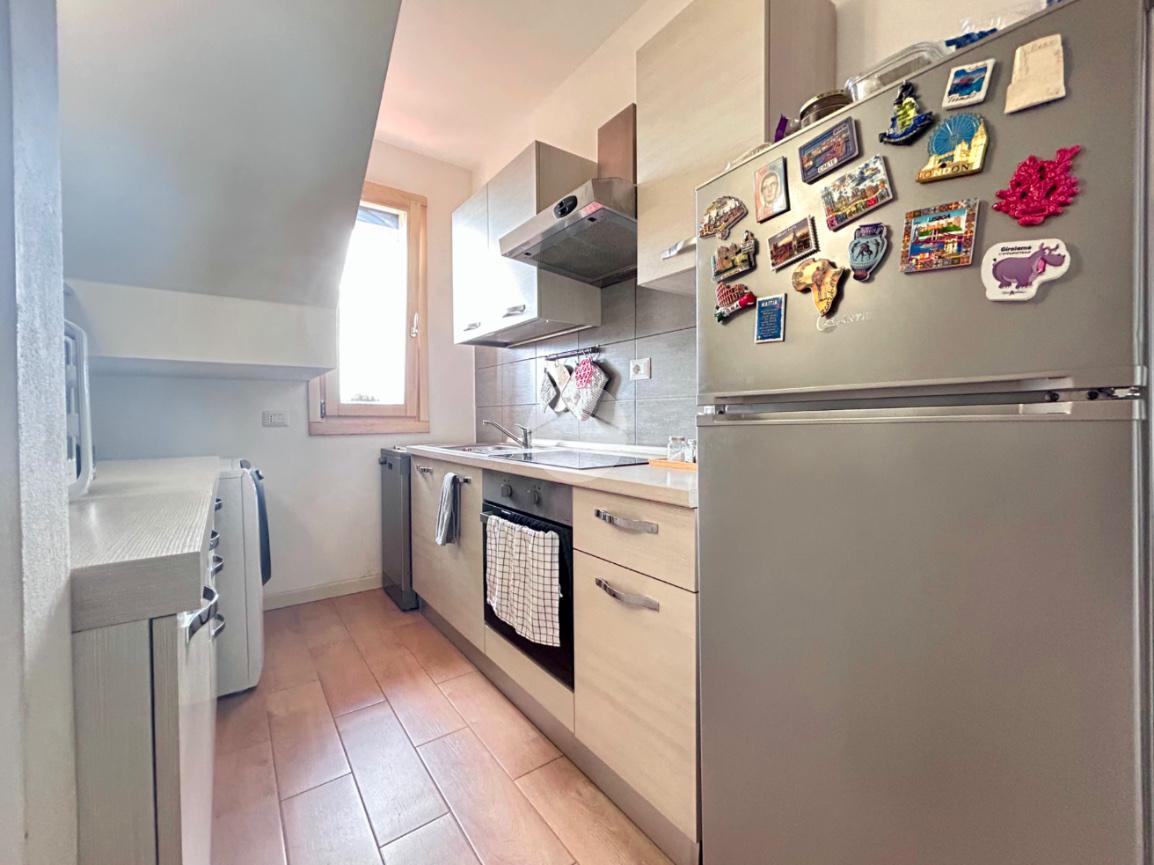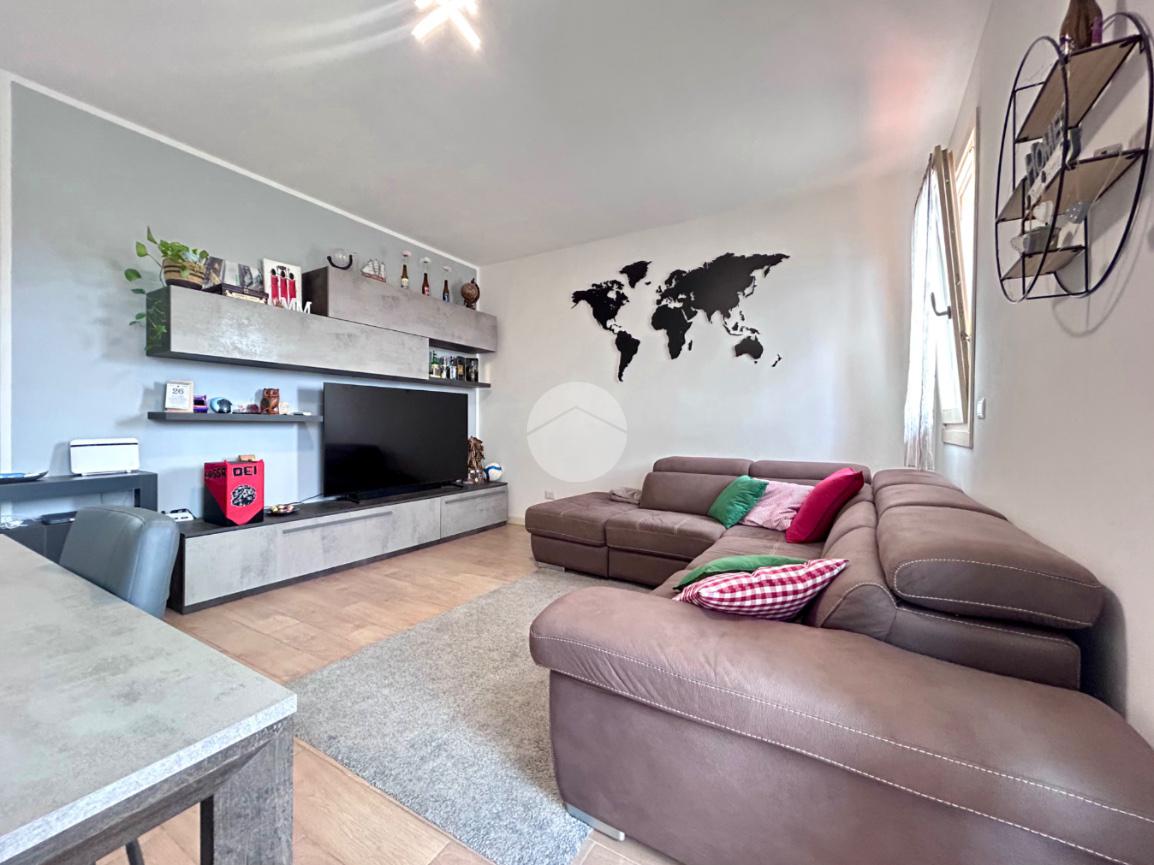 Dalla scala interna o dall’ascensore, accediamo all’ampio soggiorno con accesso al balcone e alla cucina in due ambienti separati.