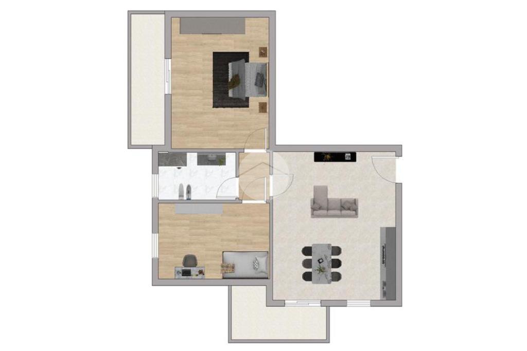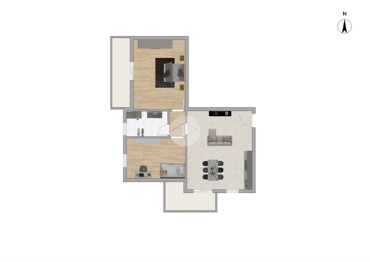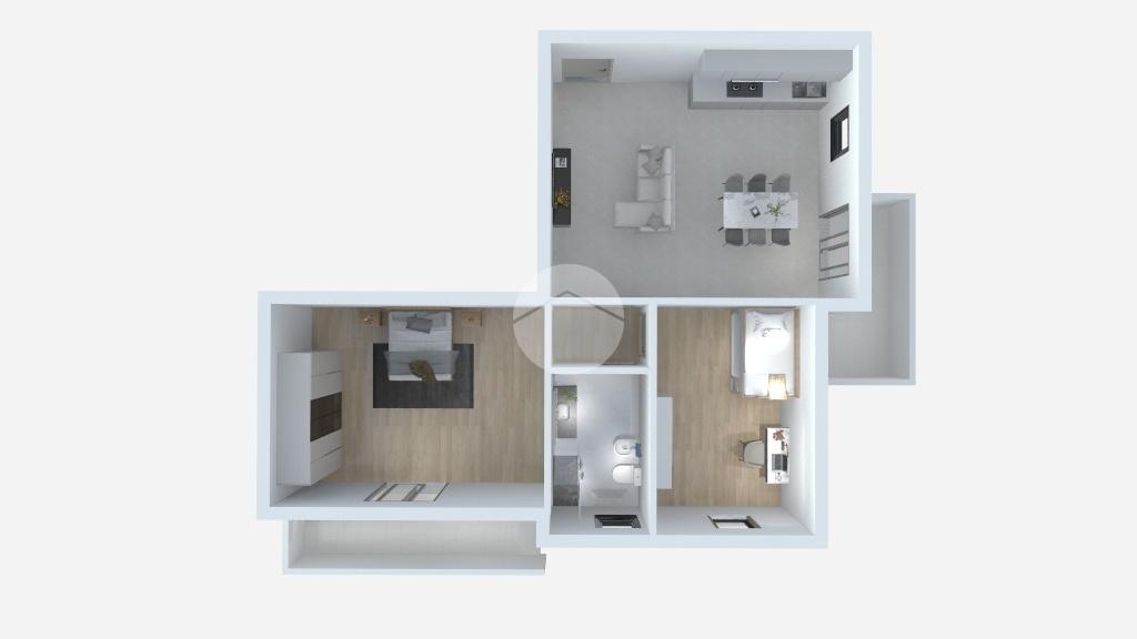 In palazzina edificata nel 2007, all'ingresso dell'immobile si apre la zona giorno con soggiorno e angolo cottura con accesso al primo balcone, la zona notte è composta da una camera matrimoniale con accesso al secondo balcone, una camera singola, infine un bagno finestrato con doccia.