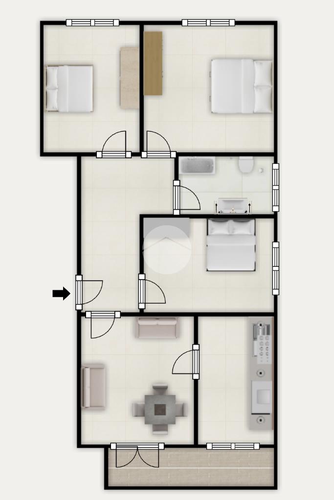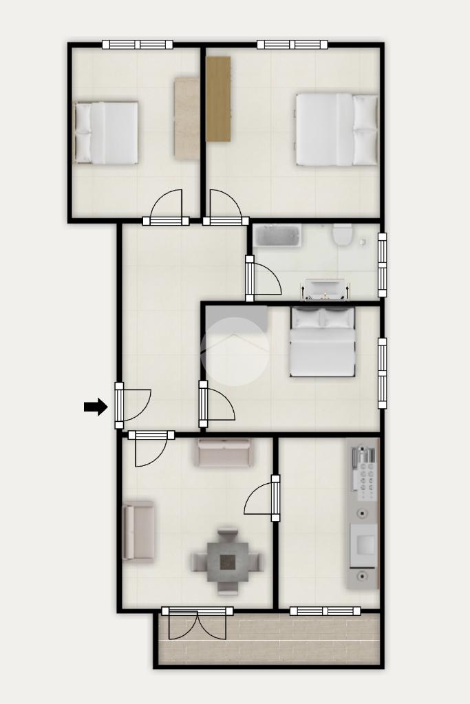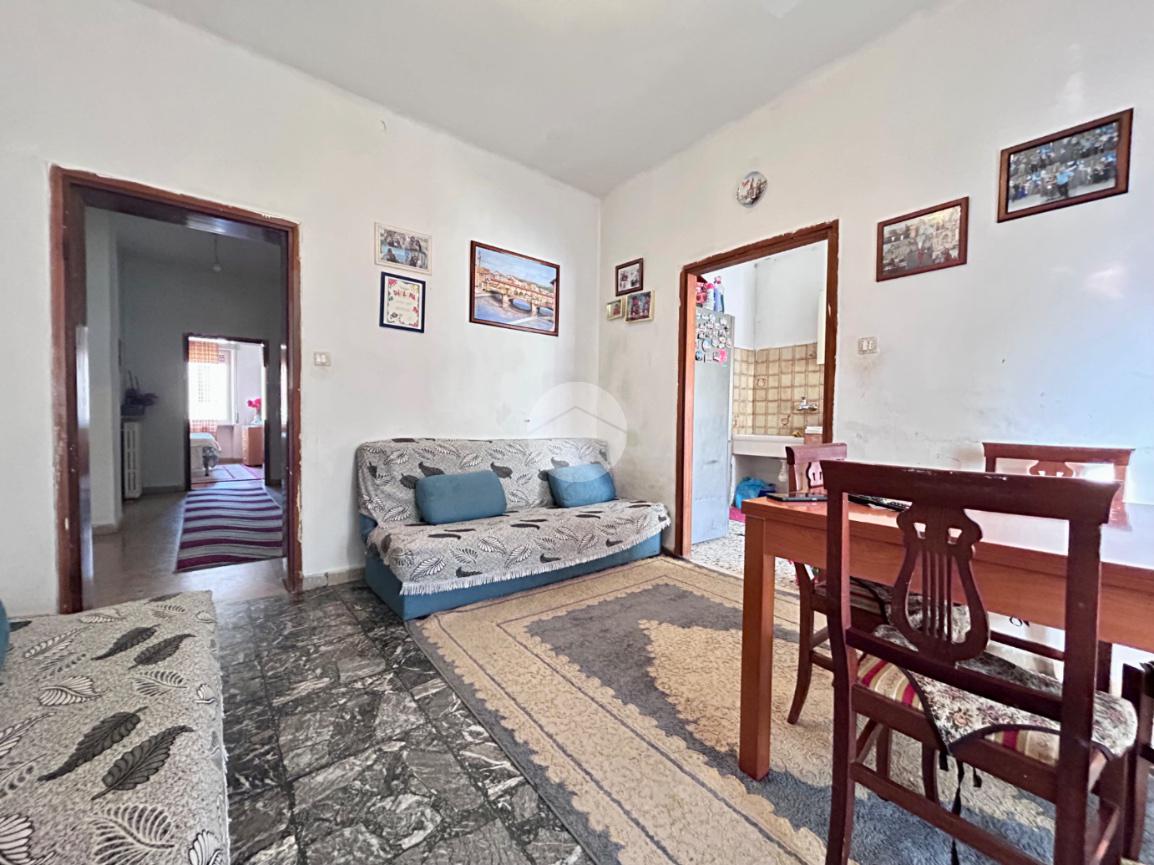 Dall’ingresso accediamo all’ampio disimpegno che divide la zona giorno dalla zona notte e l’immobile è così composto: soggiorno con cucinotto e accesso al balcone, tre camere da letto matrimoniali, infine un bagno finestrato con vasca.