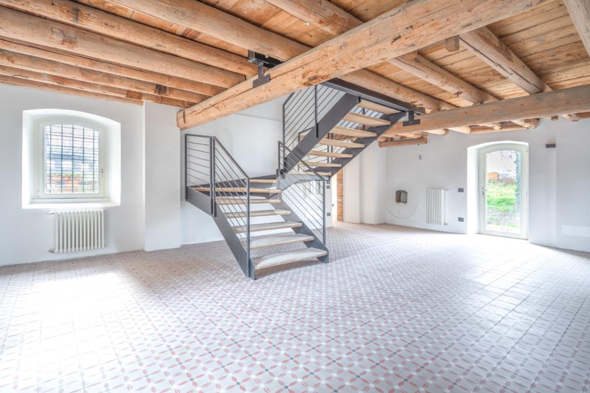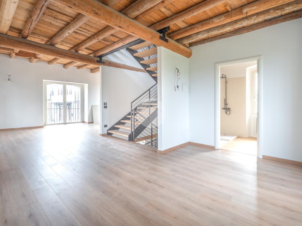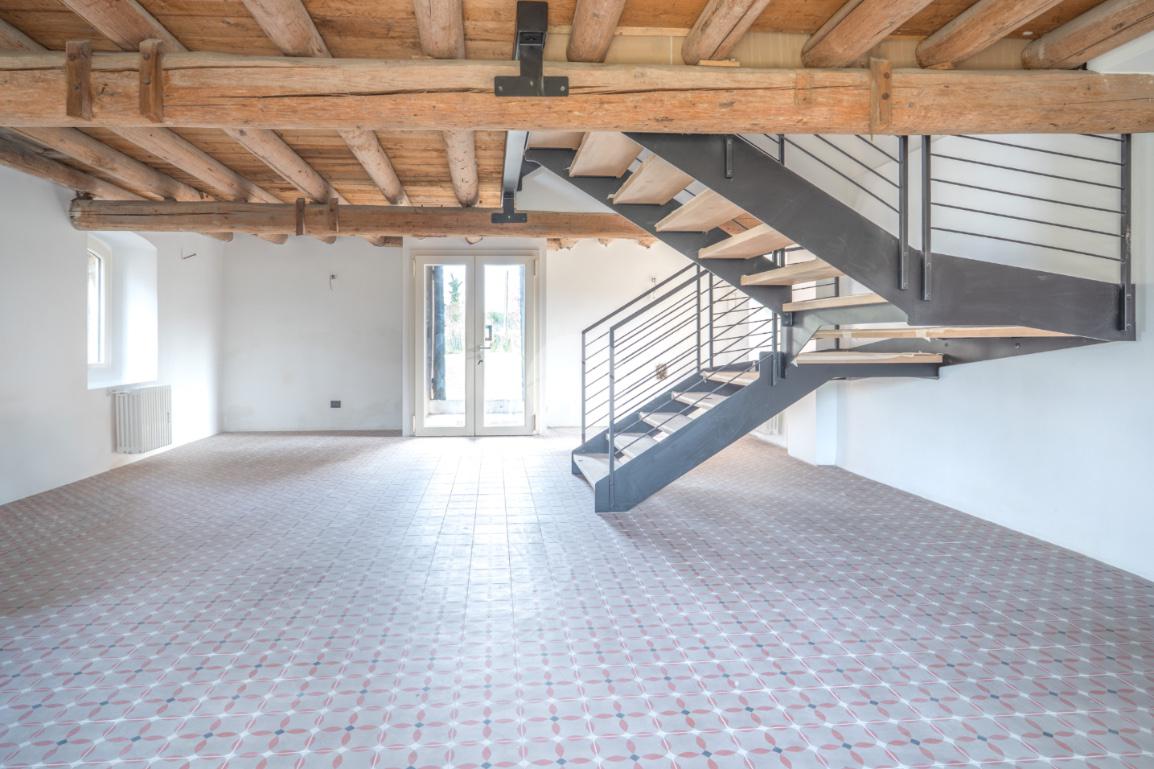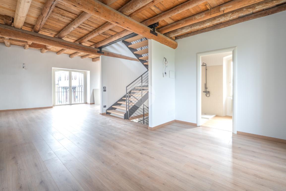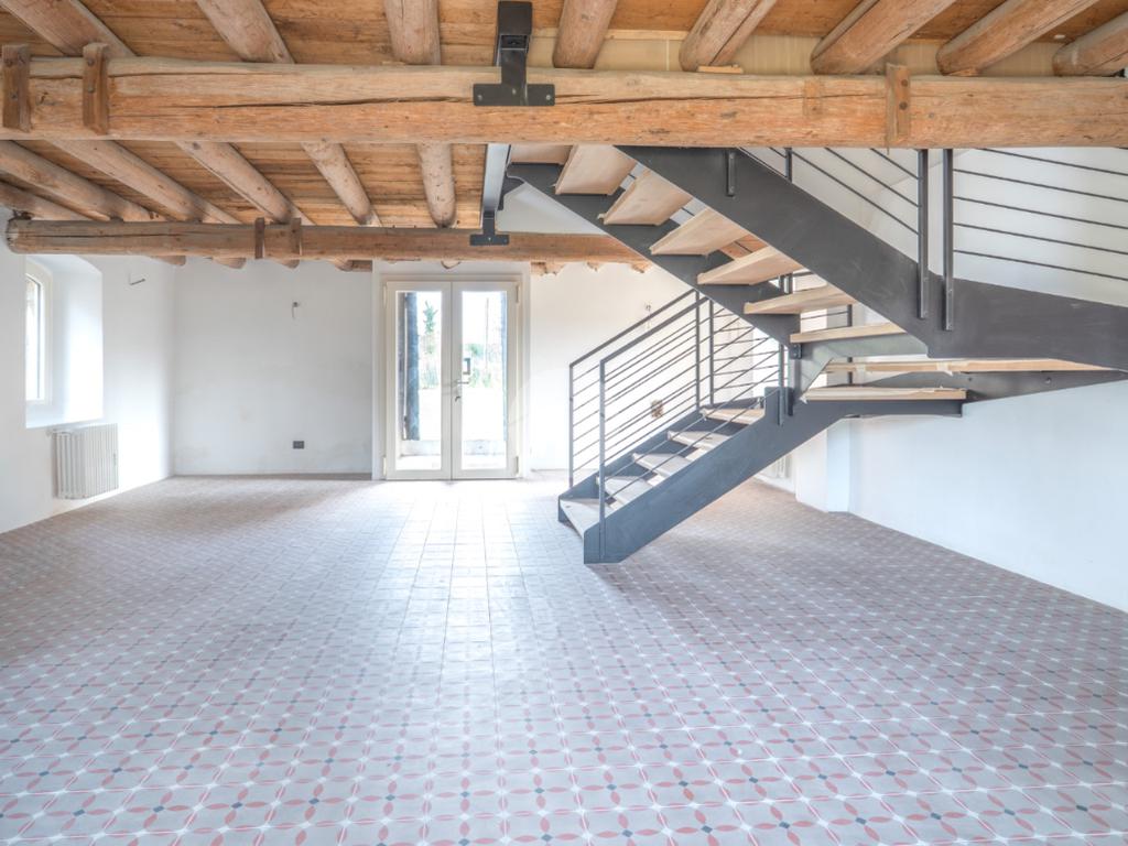 Tutti i livelli sono impreziositi dal dettaglio delle travi a vista originali del 1600, che regalano personalità e contrasto tra storia e modernità a tutti gli ambienti.