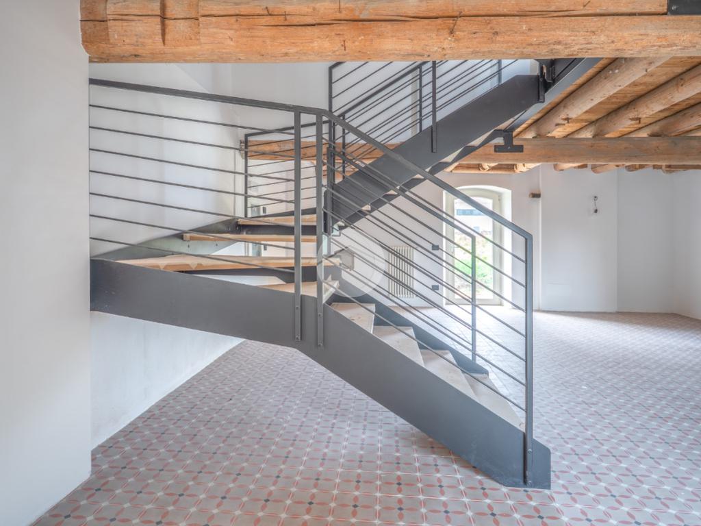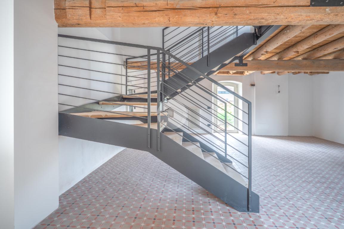 La scala è impreziosita dalle scale in legno e dal corrimano in ferro.
